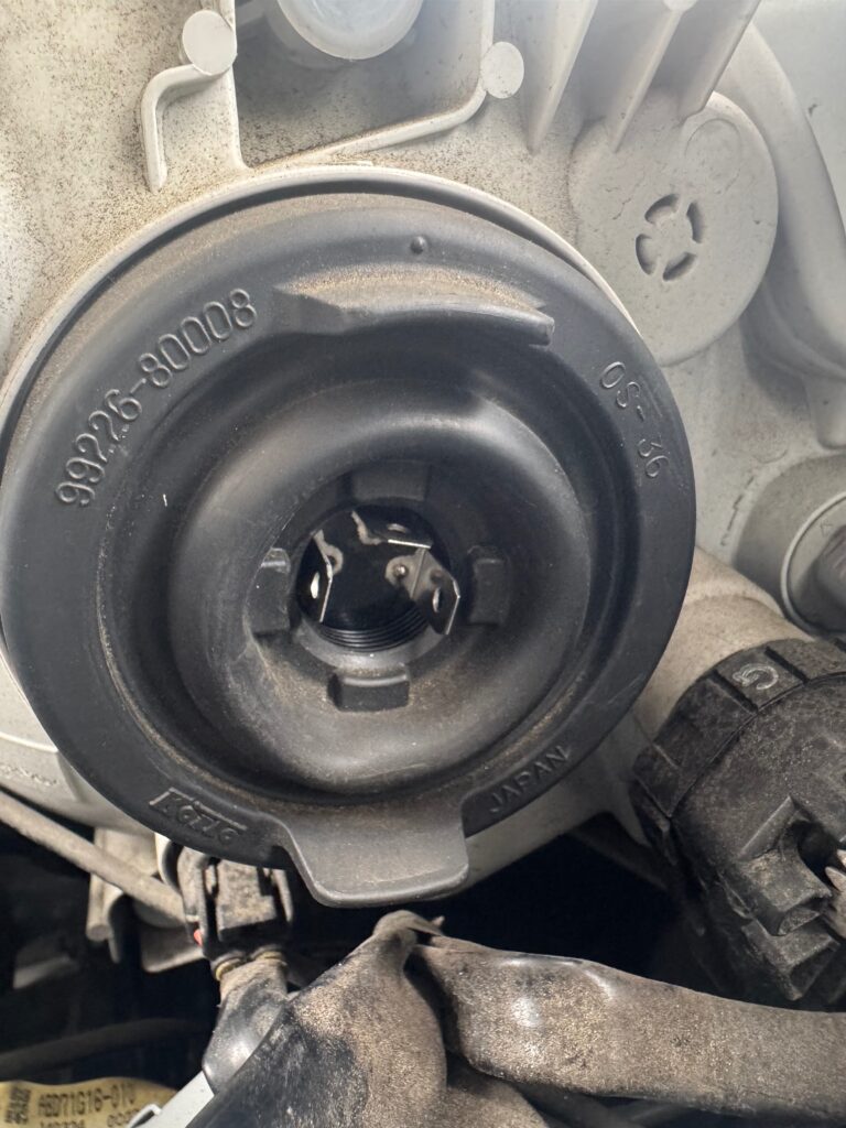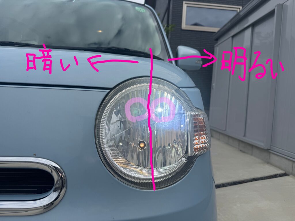 今回指摘されたのは右側のLEDバルブで下の写真のように正常な左側と比較すると車両中央側のLEDが球切れをしてしまっている。
